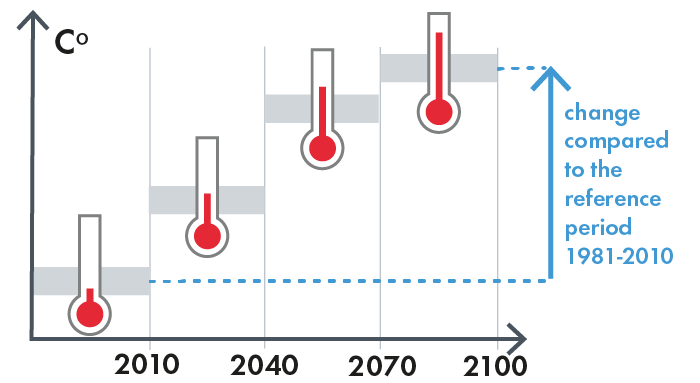A starting point is the emissions scenarios. What would you like to look at? Business-as-usual or a moderate path? Scenarios for the evolution of greenhouse gas emissions are provided by Representative Concentration Pathways (RCPs) or Shared Socioeconomic Pathways (SSPs).