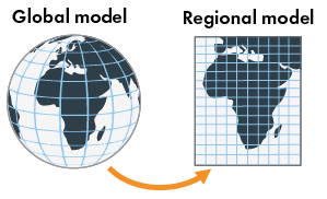 It requires a lot of computer power to run a climate model, and even though the computing capacity is constantly increasing, calculations in the global climate models are still made with a rather sparse grid of several hundred kilometers. This means that the level of detail on a local or regional scale is low in the global model. However, if you want to study a smaller part of the Earth in more detail, you can use so called regional climate models (RCM). In a regional model, the grid is positioned over a smaller area, which means that you can get a denser grid (and more detail, e.g. 50 kilometers) with lower computing power. What happens outside the calculation area in a regional climate model is governed by the results of a global climate model. In this way changes that take place outside the regional model area are considered. This way of using the results from a global model in a regional model is called regional downscaling.
