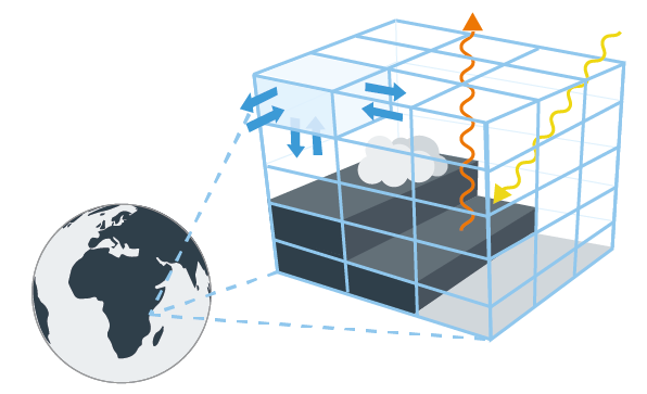 The climate models are three-dimensional mathematical descriptions of the climate system: the atmosphere, land surface, oceans, lakes and ice. In a climate model, the atmosphere is divided into so-called grids along the earth’s surface that extend up into the air, as visualized in the figure.