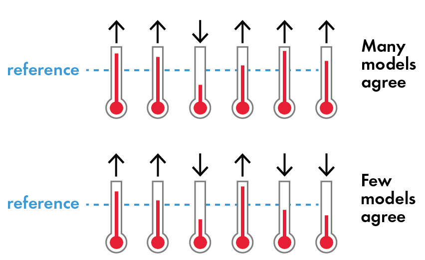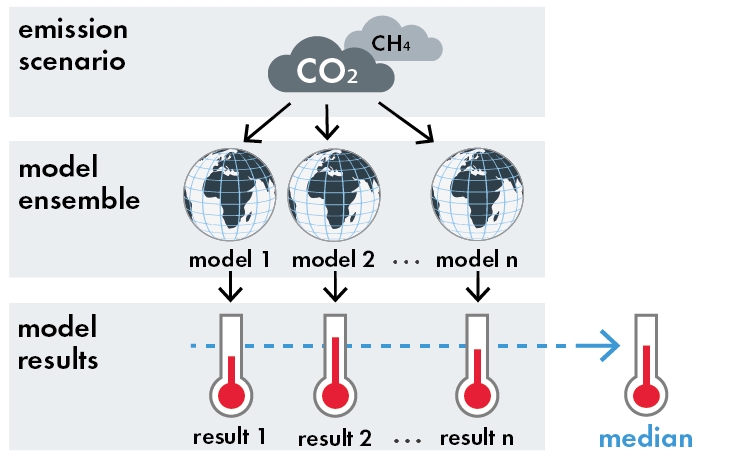 Global Climate Models (GCMs) are then applied to calculate projections of how the emissions affect climate. The various GCMs differ in their sensitivity to the greenhouse gas forcing, and also in how they simulate different processes in the Earth’s climate; each having their own strengths and weaknesses. An ensemble of models has proven more reliable, as the uncertainties stemming from the different models to some degree cancel each other. Ensemble statistics, e.g. the median result from of a number of models, are therefore generally considered more reliable than using a single model projection.