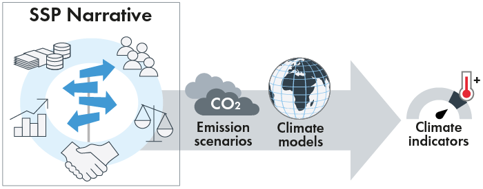 The SSP-scenarios (Shared Socio-economic Pathways) are five scenarios that describes different socio-economic developments used in climate models. The SSPs has been introduced because the climate is changing due to the emission of carbon dioxide, other greenhouse gases and the change of land use . These factors such as emissions of carbon dioxide, other greenhouse gases and the change of land use are crucial to describe the evolution of the future anthropogenic climate forcings and, and therefore the climate scenarios need to take these factors into account. The SSPs differ in terms of, among other things, population development, equality, energy use and global carbon dioxide emissions. In all SSPs, the global economy is growing. Read more about the characteristics of the SSPs in the article “What is SSPs? and What is the difference between SSPs and RCPs? ”.